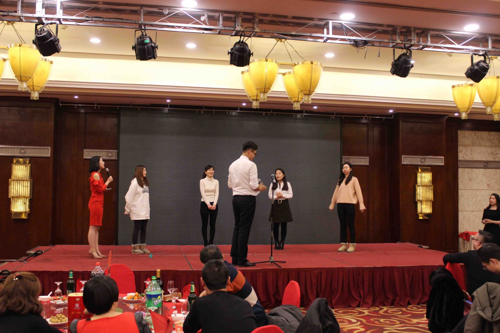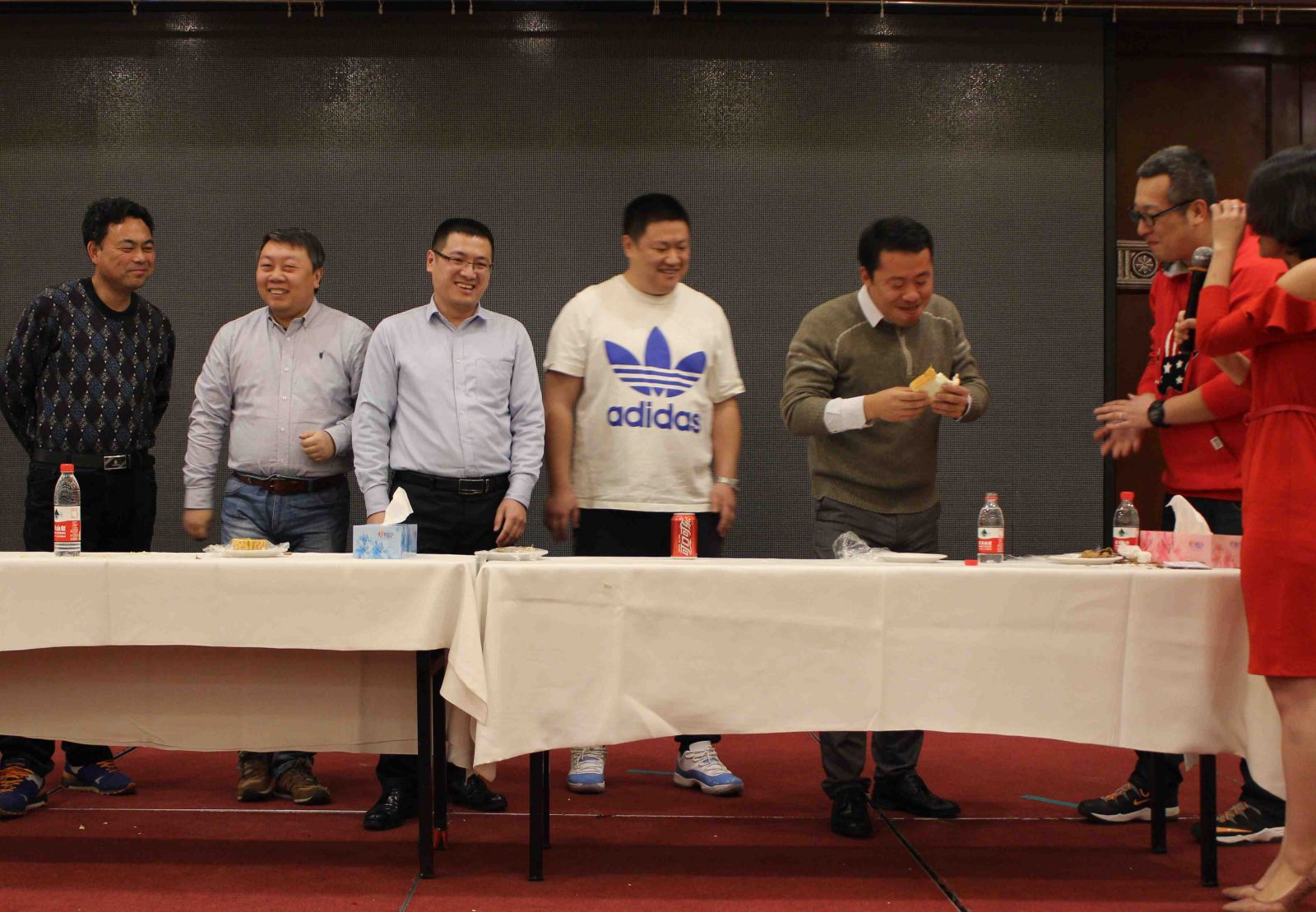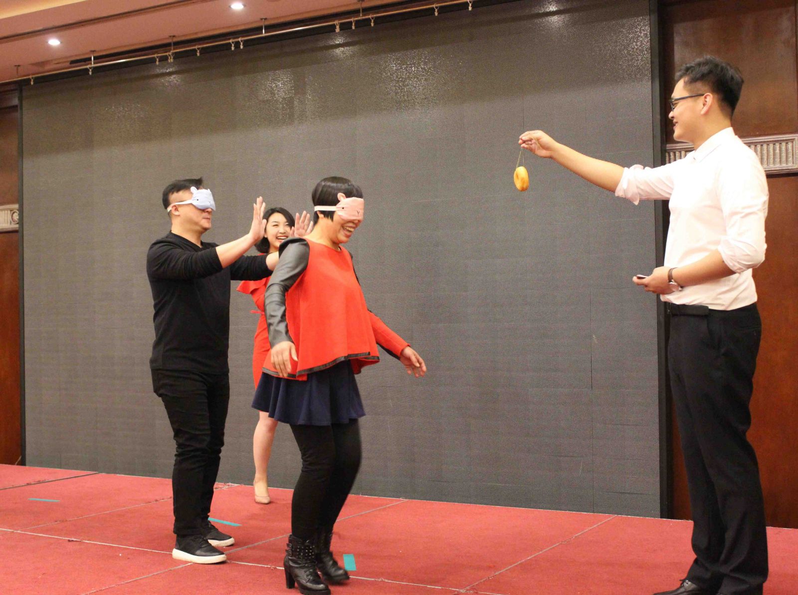 拓展環節將氣氛推向了高潮,滿場歡聲笑語。"吃掉甜甜圈"、"我愛記歌詞"、"歌曲猜猜猜"、"嘴的盛宴"等游戲涌現出了一批高手,凸顯了天順人才濟濟。尤其是"嘴的盛宴",隊員們在徐欣董事長的帶領下團結協作,攻克難關,最終成功完成了任務。"團結"、"克難"、"聚力"、"共贏"貫穿整個拓展環節,每位家人都受益匪淺。